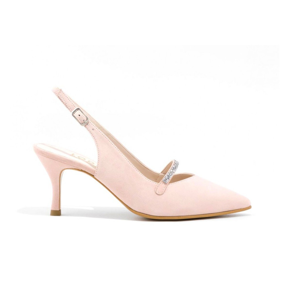 Salón ERISTE, confeccionado en ante de color rosa palo, tiene una tira de cristales de Swarovski® sobre el empeine. Cierre mediante hebilla y tacón de 7 cm de altura. El salón Eriste incorpora una planta de gel para que no pierdas la comodidad.